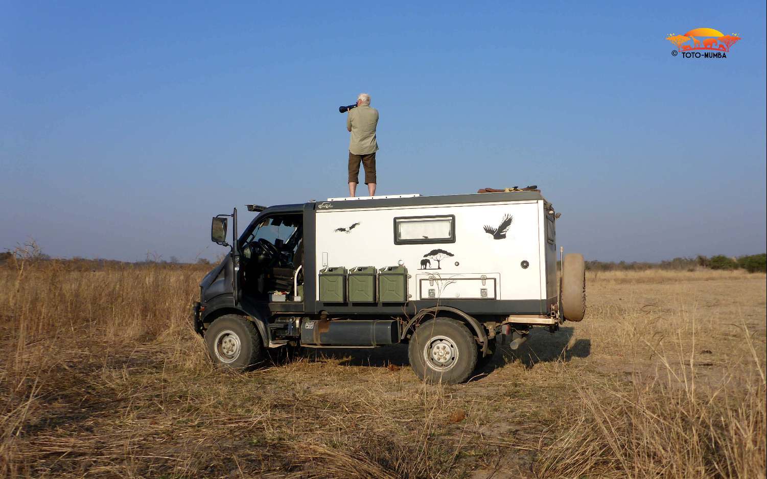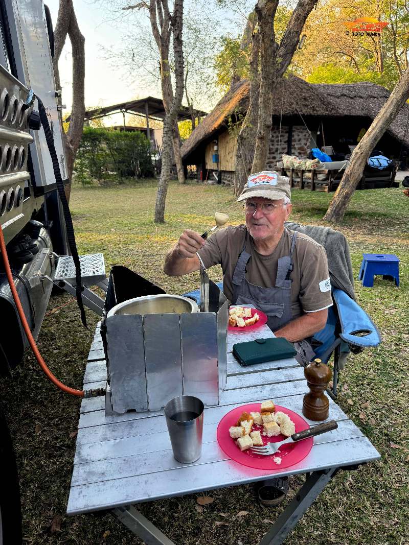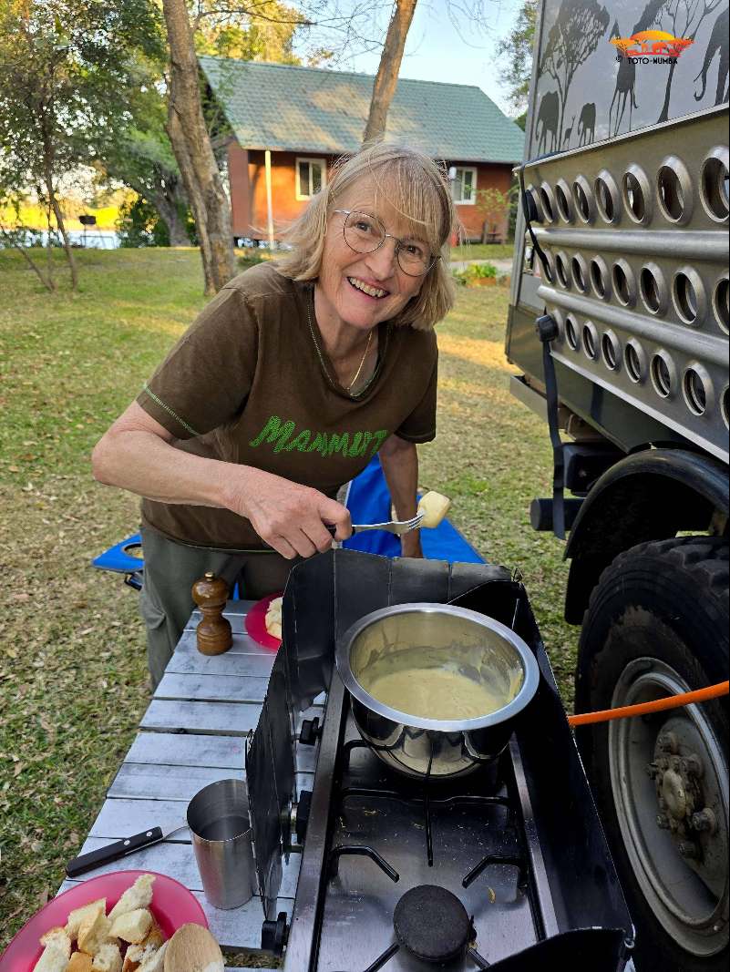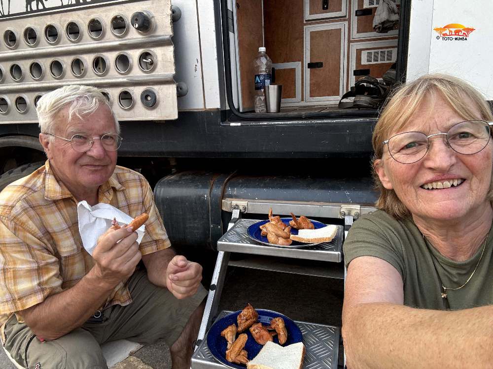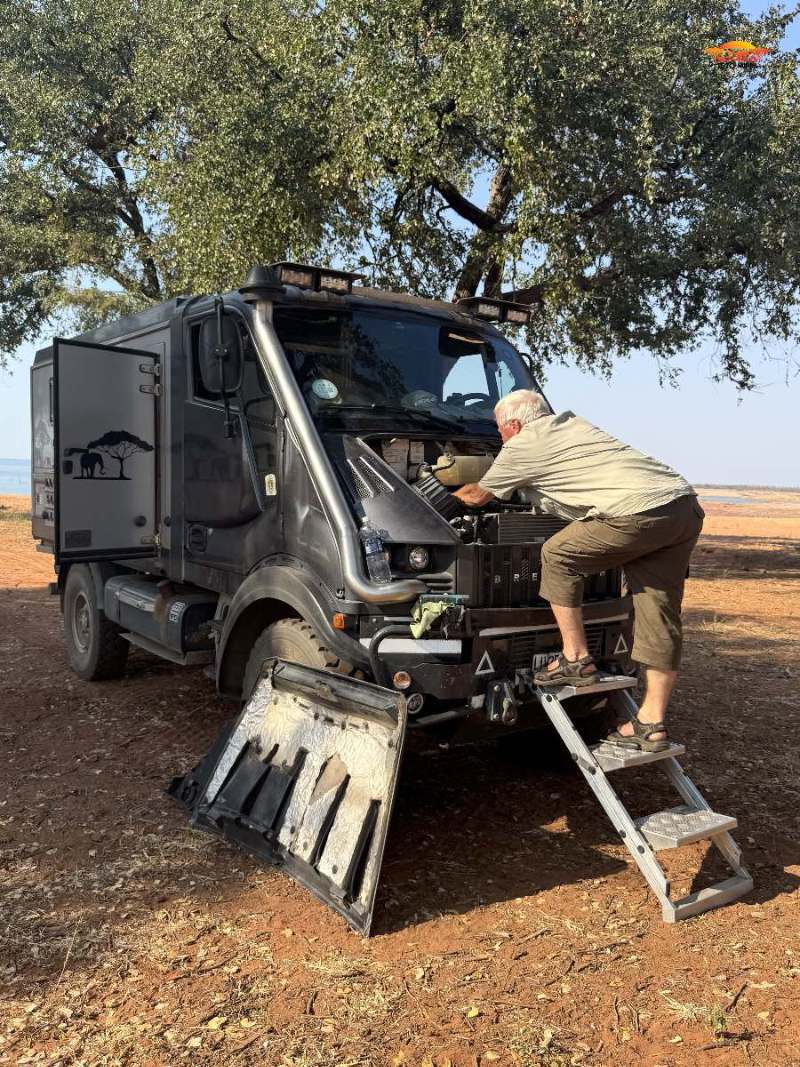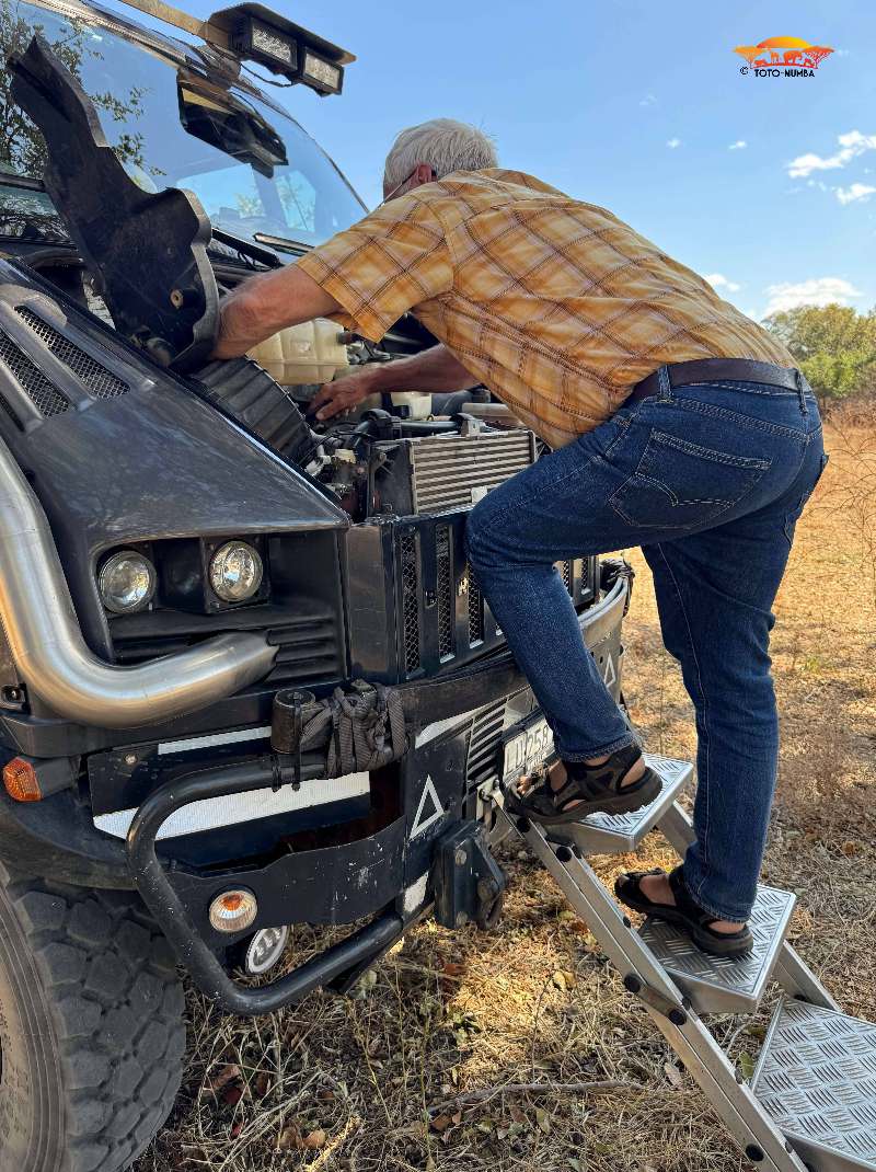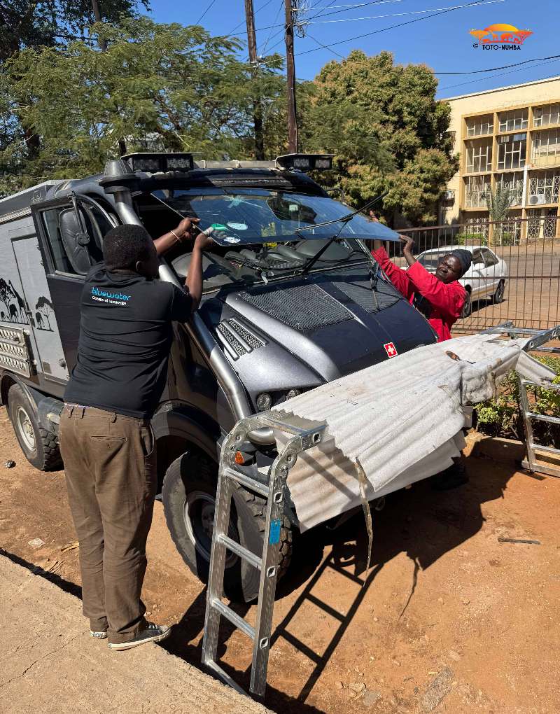 Wieder reisten wir mit einigen fürs Auto bestimmte Ersatzteile und einem Kühler nach Livingstone. Eine Woche lang war Peter und zum Teil auch mit Hilfe von Mechanikern beschäftigt, unsere Toto-Mumba auf Vordermann zu bringen. Die letzte Arbeit am Auto war, beim Glaser in der Stadt, die vom Steppenpavian zerstörte Windschutzscheibe zu ersetzen. (Hierzu ist zu erwähnen, dass wir eine Originalwindschutzscheibe im Frühling direkt von Italien nach Livingstone (Sambia) und direkt zum Glaser spedieren konnten.) Nach dieser getanen Arbeit konnten wir endlich unsere Reise starten.