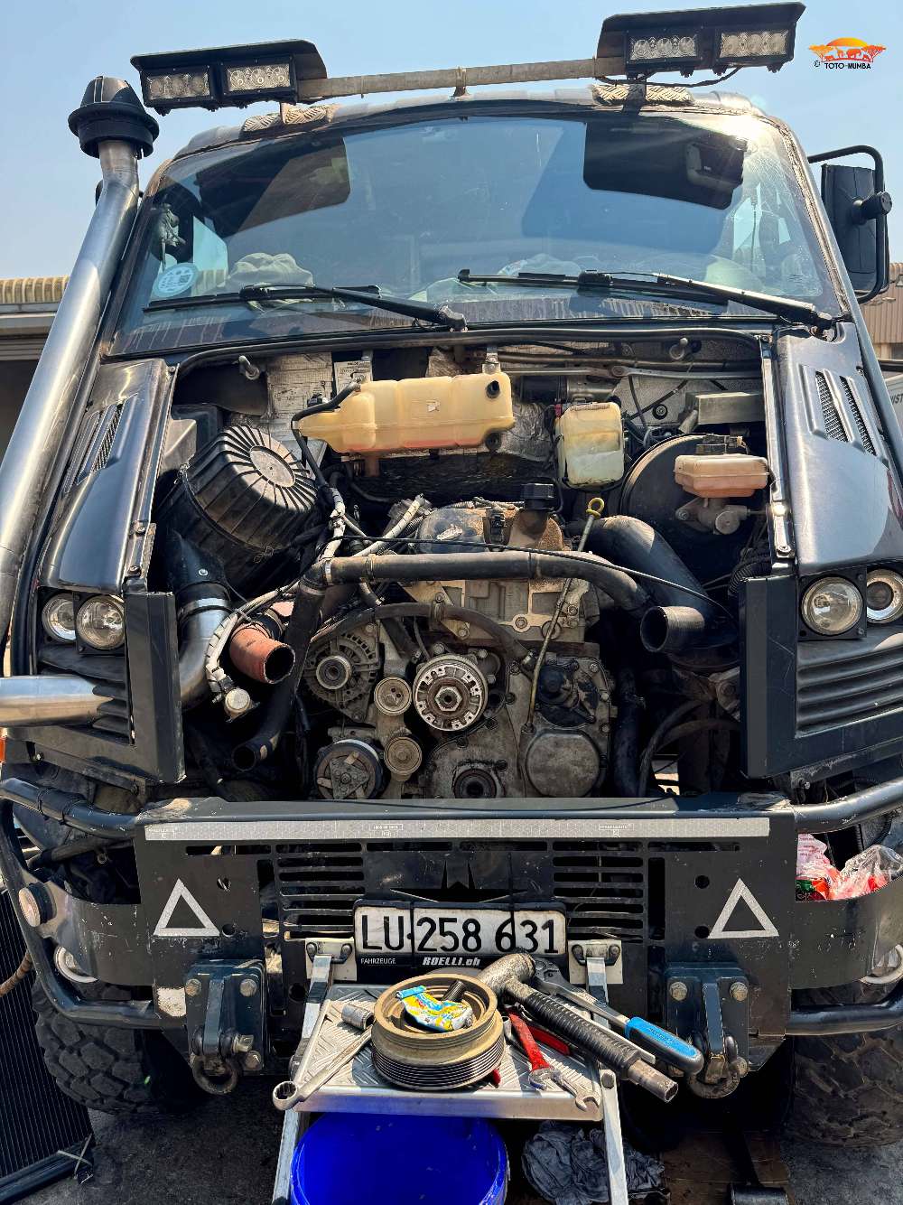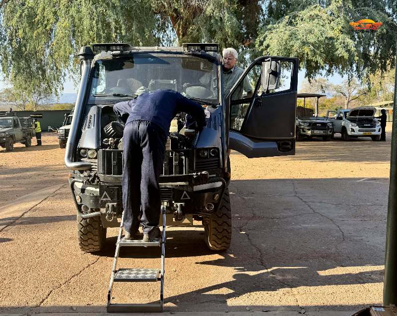 Anderntags standen wir schon morgens um 7 h in der Iveco-Werkstatt. Den ganzen Tag lang wurde am Auto repariert. Einzelne Teil mussten die Mechaniker selbst anfertigen oder anfertigen lassen. Am Abend war überhaupt noch nichts fertig gestellt. Der Werkstattchef eröffnete uns, dass wir hier in der Werkstatt in unserer Toto-Mumba übernachten können. Juhui, das fanden wir lustig, hatten wir das vor Jahren doch schon mal bei Iveco in Francistown (Botswana) erlebt.