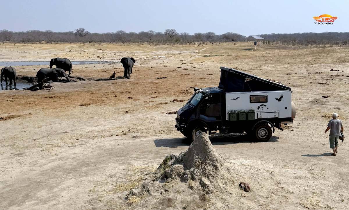 Am Nachmittag darauf war Toto-Mumba endlilch wieder fit und wir führten die Reise wieder fort. Über Choma und über die Grenze nach Victoria Falls in Zimbabwe erreichten wir ein paar Tage später den Hwange NP. Endlich konnten wir hier zwei herrliche Wochen geniessen und uns nur unserem geliebten Hobby, den Tierbeobachtungen, widmen. Auch konnten wir (dank fast keiner Touristen) direkt an einigen Wasserlöchern campieren und erlebten so tolle Tierbegegnungen.